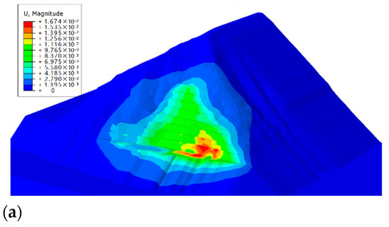 - When the excavation is completed, and the whole slope is balanced, the incremental deformation of the slope is between 3–160 mm, and the maximum value mainly occurs in the block with an elevation of 465–480 m and is surrounded by faults FZ8 and F15. The deformation of the front edge of the excavated slope is significant, and the rear rim is small.