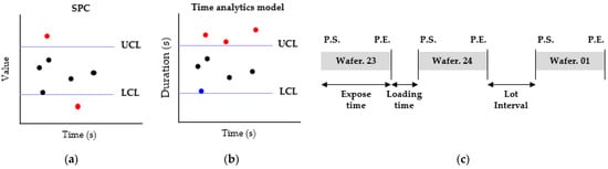 Statistical process control (SPC) methods are commonly used in the manufacturing industry [17]. A univariate SPC value is used to control an important single target value so that it is within a specific range (Figure 1a). In the case where the SPC value is out of the specific range (red dots), SPC reports a fault. SPC is generally a simple and effective system that controls key factors related to quality. Whereas the time analytics model is a simple and powerful system that not only controls process time but also checks the cause of productivity degradation immediately. Figure 1b shows the wafer loading time in the time analytics model. The control range is the normal distribution of the cluster closest to the minimum time. The lower control limit (LCL) is the minimum wafer loading time (blue dot) and the data only exceeding the upper control limit (UCL) are detected as a time-increased wafer. The EUV equipment repeats the process of exposing the reticle pattern to the wafer with the light source and loading the next wafer. The system categorizes the process time into three categories (expose time, loading time, and lot interval) by combining the time at the beginning and end of exposure and controlling each range (Figure 1c). This paper has focused on loading times that have relatively large variations and require improvement.