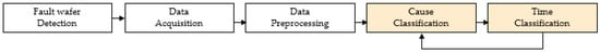 The time analytics model classifies the cause of the increase in process time using two methods. First, cause classification uses a decision tree to classify time-increased wafers. The decision tree has the same number of algorithms as the number of types of classified causes. The simplest algorithm is made only with the same type of event code as AB-1234. The most used types of algorithms are made by combining equipment logs or sensor signals. Each algorithm is developed using the cross-industry standard process for data mining (CRISP-DM). Algorithms created by detailed equipment logs have high accuracy and currently classify 98.6% of time-increased wafers. Second, time classification classifies the 1.4% of the time-increased wafers that cannot be classified in cause classification by the machine learning method. Since there is no factor in classifying the cause, the process time (average 21.6 s) of the single wafer is divided into four hundred steps. Detailed time steps that affect the increase in the process time are detected through normalizing and clustering. After analyzing the characteristics of the classified clusters, a new algorithm is created and added to the decision tree. Figure 2 shows the flow of the time analytics system.