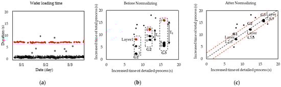 (a) Shows wafer loading time of each wafer, where red data are clustered in a specific time range. (b,c) Show the process of normalization, where each layer has different waiting times (Ti) for normalization.