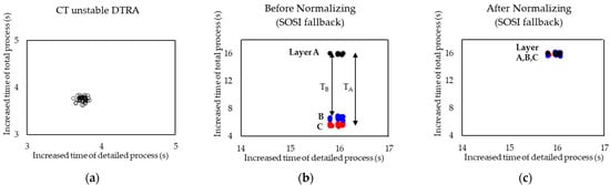 Time-increased wafers (1.4%) that are not classified by the cause classification are classified by time classification. Time classification classifies time-increased wafers through normalizing and clustering processes. We found a system defect in the normalizing process during the experiment. Figure 4a shows an example of clustering without a normalizing process. The CT unstable DTRA, one of the causes, has been clustered after the target equipment and data collection period was extended because the occurrence rate was only 0.09%. Since it belongs to the wafer loading time, it was required to be normalized. Nevertheless, clustering was completed without normalizing. We have been able to find the solution in the definition of the wafer loading time (Equation (7)). To analyze all the time of the equipment, the system defined the time between the wafer exposure as the wafer loading time. Contrarily, there are other detailed processes between wafer loading and exposure start. The detailed processes after the actual wafer loading are not affected by the waiting time and do not require normalizing. Hence, the normalizing method has been modified. Figure 4b,c are examples of a cause that required normalizing and could classify clusters only after normalizing was completed. Three layers have similar max increased time of the detailed process (Xi) and a different increased time of total process (Yi). The normalizing process of correcting the waiting time (Ti) for each layer is essential in mass production. In the case of SOSI_fallback, the probability of occurrence is only 0.9%. In addition, approximately thirty process layers have different waiting times (Ti) in mass production. Hence, the system recognizes the probability of occurrence of the cause as 0.03% and cannot complete clustering. We have been able to generalize more data by correcting the waiting time (Ti), which is characteristic of the equipment and process layer. In the future, the classification ratio of time-increased wafers is expected to be higher than the current 98.6%.