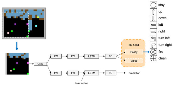 As shown in Figure 1, the bottom half of the model is the prediction module and the top half is a standard RL module equipped with a RL head. The RL head is trained to learn a behavior policy , and in the A3C approach, the value function is also learned. To extract the latent state of the environment and enhance the long-term memory of the agent, we connect these two modules to a convolutional layer and equip each of them with a long short-term memory (LSTM) recurrent layer [44]. Moreover, the prediction model is essentially a supervised model, mainly trained by observing other agents’ action trajectories.
