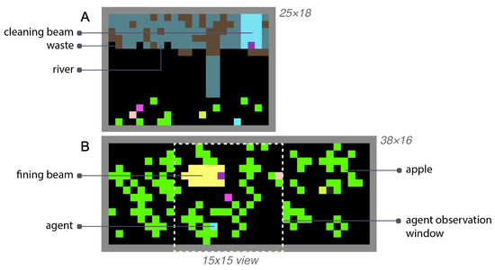 In the cleanup(Figure 2A), a player is rewarded for consuming apples within a 25 × 18 grid-world environment. For every apple consumed by an agent, its reward increases by 1. The growth rate of apples in the orchard is directly proportional to the cleanliness of the nearby river. Over time, the waste in the river increases with a constant probability. When the waste exceeds a certain threshold, the apple growth rate drops to zero. Players can clear the river by firing a cleaning beam. However, the cleaning beam has a limited range, affecting the waste within a short distance in front of players. Thus, players need to maintain the public good of apple regrowth by leaving the orchard to clean the river. In addition, the costly punishment is one of the agents’ actions, which is of critical importance in sequential social dilemmas [47,48]. Players can use the penalty beam to punish other players at a small cost (reward-1), and the reward for other players will be reduced by 50. That may be used to discourage free-riding.
