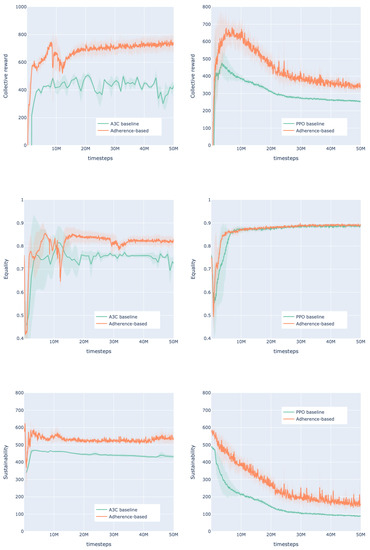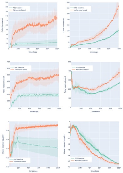 At the beginning of training, agents begin training by acting randomly, diffusing through the space, and learning to clean the river. In the experiment, the agent needs to obtain a large number of apples in order to maximize personal benefits. However, in the face of limited apple resources, the agents have to attack each other, which makes the total waste and the equality drop sharply. Then the group falls into a social dilemma. Ultimately, A3C baseline agents are unable to coincidentally avoid the tragedy, and the total reward converges to near 20, step by step. Meanwhile, the PPO baseline agents’ total reward is slowly increasing. After applying the adherence-based algorithm, the collective reward of the A3C approach quickly surpasses the baseline and keeps increasing. In the PPO approach, the overall reward is also rising rapidly, rising faster than the baseline. The collective reward of the algorithm (A3C) reached an average of about 140, and the algorithm (PPO) reached about 400.