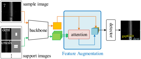 On the basis of increasingly extensive research on attentional feature fusion approaches [12,13,14,15], recent detection tasks [16,17,18,19,20] suggested that the idea of exploiting extra features can potentially improve detection performance, especially with insufficient training data. In these attempts, extra information are usually encoded into class-wise/channel-wise feature vectors or pixel-wise relation matrixes for retrieving. However, these methods are proposed for solving the few-shot learning problem. In this work, we borrow the idea of the attentional feature augmentation under the fine-tuning strategy to solve the rail defect detection.