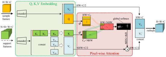 Feature augmentation framework. The sample and support features are first encoded into query (Q), key (K), and value (V) embedding. Two linear transformations are performed on both Q and K feature maps. Pixel-wise attention is performed to fuse the Q and K feature maps to form the final learnable similarity metric, thus retrieving co-existing information from support features.