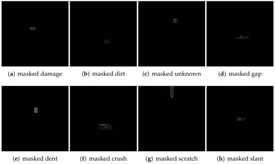 The support defect images are randomly selected from the training set and mask it using its label. One of the chosen result of the eight defect classes are shown in Figure 4. If four classes detection is analyzed, the defect class is randomly chosen from defect, unknown, dirt, and gap.