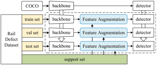 Demonstration of learning strategy of our detection framework. The backbone is pretrained on MS COCO, and fine-tuned on the rail defect dataset together with our proposed feature augmentation module.
