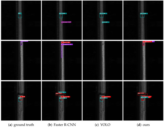 In industrial applications, dirt and gap objects can be ignored, whereas unknown objects are usually regarded as potential defects and should be double-checked manually. Therefore, false detection may cause additional manual inspection time. The detection result revealed that Faster R-CNN is too sensitive and confident to identify many objects that did not exist or need to be ignored. On the contrary, YOLO missed some objects and is too rigid to doubt the training samples. The feature augmentation framework can give scores to help balance the sensitivity and robustness of the model. It can increase the confidence of objects with obvious features but not correctly labeled (e.g., the unlabeled gap in the third row of Figure 6), while reduce the confident of objects with features similar to certain class but are ‘far’ to selected support defects (e.g., small objects in the first row of Figure 6 that should be ignored).