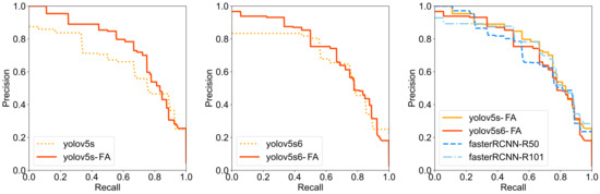 Three group of PR curves, from top to bottom are PR curves of: YOLOv5s and YOLOv5s with FA, YOLOv5s6 and YOLOv5s6 with FA, and two YOLO models with FA compared with two Faster R-CNN models.