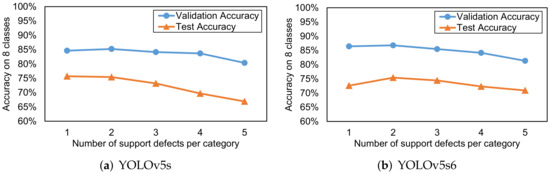 Effect of different number of support defects per category on validation and test performance of (a) YOLOv5s with FA and (b) YOLOv5s6 with FA.