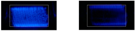 It is well known that Vth, Cg, and Cd are physical parameters determined by the gas composition, pressure, dielectric material, and geometry; these three values define the behavior of the equivalent circuit, which remains predictive as long as the surface covered by the plasma on the electrodes, remains stable. Indeed, variations in the identified parameters as a function of the electric conditions given by the power supply are common, even if the reactor geometry does not change [11,12]. As shown in Figure 11, this can be observed in the case of the DBD reactor used in this work: here, the electrical energy injected into the plasma, controlled by the power supply, is changed. Accordingly, the discharge covers the whole surface of the reactor ((a), β = 1) or only part of it ((b), β < 1). Note that, concerning the identified parameters of the equivalent circuit (Figure 10), Ceq is similar for both cases, however, identified Cd and Vth change significantly: being physical parameters of the reactor, such changes are not acceptable.