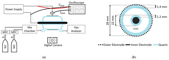 The schematic diagram of the experimental setup is presented in Figure 2. The system consists of a DBD reactor, a gas blending system, a power supply, measurement instruments, and the control interface: