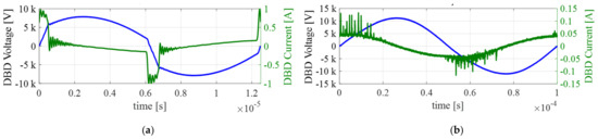Typical electrical waveforms (vDBD, blue and iDBD, green): (a) Square Current Source: here, fsw = 80 kHz, J = 1 A, d = 10%. (b) Sinusoidal Voltage Source: here, vDBD_peak = 11.2 kV, f = 10 kHz.
