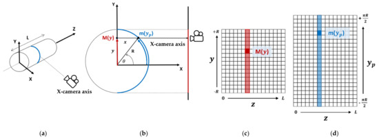 On the taken image, the reactor cylindrical shape is flattened by the camera, as shown on Figure 6. The reactor has length L and is placed along the Z axis; the camera’s optical axis is on the X axis. The plane (X, Y) is an orthogonal cross-section of the reactor (Figure 6b). The points m(yp) cover the external surface of the reactor, at outer radius r, for θ ranging from −90° to 90°. The point M(y), with y ranging from −R to +R, is the orthogonal projection, captured by the camera, of the points m(yp). Only the outer electrode is shown. Several geometrical assumptions are made: