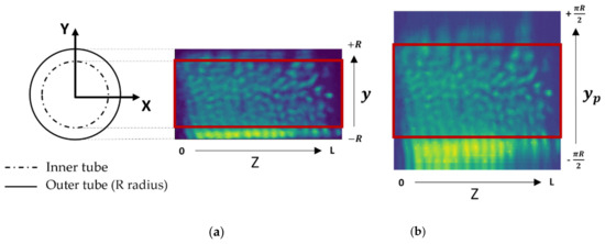 Equation (2) is obtained by a basic trigonometric manipulation: the length , which is also a circle segment, is equal to the radius R multiplied by the θ angle. The ratio from Equation (3) is a first-order approximation obtained with first y-derivative of Equation (2). Using these equations, the image is projected to cylindrical coordinates and rolled out. This process is repeated along the Z axis in all planes (X, Y) of the reactor to obtain the full picture. Figure 7b shows the obtained image in cylindrical coordinates.