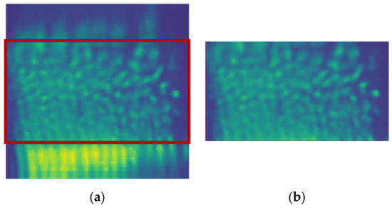 Projected unrolled image of the outer surface of the reactor: (a) Acquired grayscale image—Cylindrical coordinates output image (b). Red rectangle highlights the inner tube of the reactor.