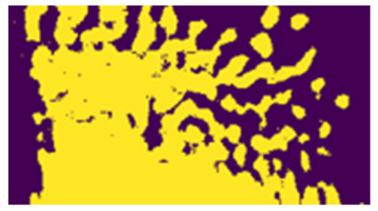 Step 2—image segmentation: the discharge area is segmented using a thresholding technique, as shown in Figure 9. It means that a gray-level value called “threshold value” is used as the delimiter between the background and the discharge area. All pixels with values less than the threshold value are considered as background, and pixels with values greater than the threshold are considered as the discharge area. In order to find the threshold value, Otsu’s method is used [24]: this method chooses a threshold value that minimizes the variance of the thresholded background and discharge pixels. The ability of this method to segment the image even with low intensity discharges (operating points at low power) of uniform appearance is remarkable (as will be shown in Section 3).