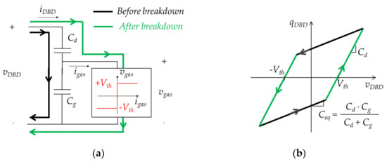 The DBD is commonly modelled in the literature by the electric circuit shown in Figure 10. Cd represents the capacitive behavior of the dielectric barrier(s), in this case the series equivalent capacitance of the two quartz cylinders. The gas is modeled as a dielectric (Cg) as long as it is not conductive (|vgas|< Vth, thus igas = 0), and after breakdown it is represented with a constant voltage (vgas = ±Vth), the sign of which depends on the direction of the gas current [15,18,19].