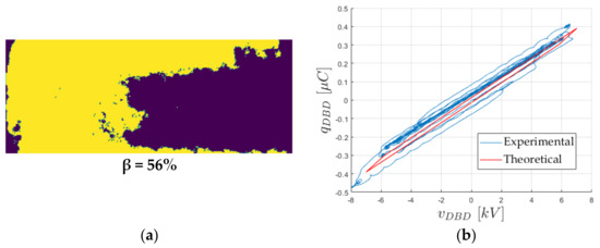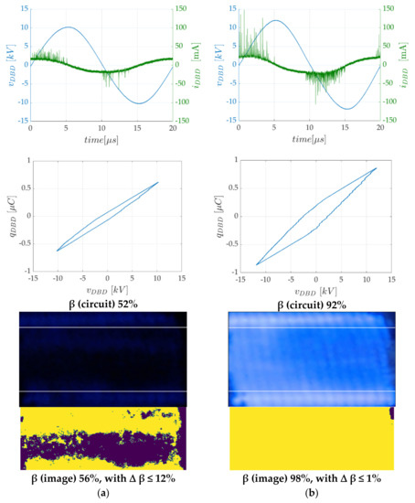 Other diagnostics of DBD systems can be also achieved on the basis of measured electrical waveforms. Using these measurements, it is possible to identify the parameters of the well-known Manley diagram [14] and its associated DBD’s equivalent circuit [15]. Originally based on the assumption that the discharge is uniform (with parameters of the equivalent circuit corresponding to a full use of the surface of the electrodes, i.e., β = 1), this approach can be simply extended [8,16] to consider partial discharging situation.