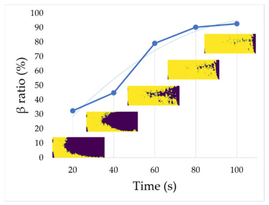 It should be mentioned that the coverage of the discharge area varies from the time the system is started, with a typical transient shown in Figure 14. Here, the record starts when the power supply is turned ON, with a gas flow already stabilized (see Figure 2). For the presented operating conditions (f = 10 kHz, P = 30 W), one can observe during the transient the rise of the discharging surface (and accordingly the β ratio), which definitively stabilizes only after approximatively 120 s. For steady-state process analyses, data should only be acquired after this system time constant.