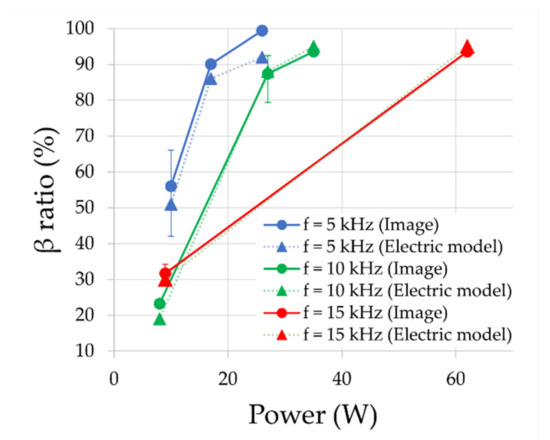 Partial discharging ratio β obtained with image processing and equivalent circuit analyzes. Results are grouped by values of supply frequency; adjustments of injected power are achieved with the peak value of imposed vDBD voltage. Displayed values are obtained in steady state.