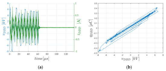 As shown in Figure 16, results obtained with the rectangular current power supply are difficult to analyze through the equivalent circuit approach: indeed, each burst of current pulses injected into the DBD creates an electrical transient (see voltage and current waveforms on Figure 16a), which has no time to vanish before the end of the burst. As a result, the Q-V Manley diagram exhibits a poorly trapezoidal shape, as can be appreciated in Figure 16b: this makes it very difficult to select the slopes to be used for the calculation of the circuit’s parameters.