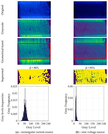 Image diagnostic of operating conditions obtained with square current source (column (a)) and sine voltage power supply (column (b))—electrical waveforms presented in Figure 3—from top to bottom: original image, grayscale, result of geometrical transformation, segmented image (central area), gray levels frequency.