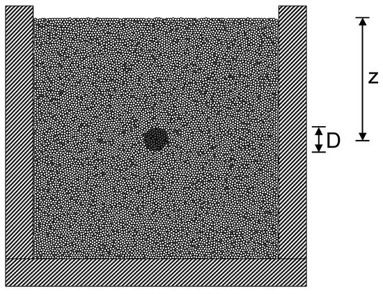 The dissolvable granular inclusion has a D = 10 mm diameter and is buried at various depths z (Figure 1). The vertical walls impose zero-lateral deformation, and the upper sediment surface is stress-free. Altogether, we run 18 cases to explore loose (e = 0.242) and dense (e = 0.184) initial packings, three burial depths (z/D = 2, 5, and 9), and three levels of granular interlocking (HR = 0%, 40%, and 80%) to vary the macroscopic friction angle.