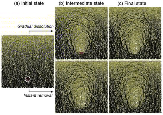 Force chains during subsurface volume contraction: quasi-static gradual dissolution vs. instantaneous removal. The white circle indicates the original location of dissolvable inclusions, and the red particles are soluble. (a) Initial force chains. (b) Intermediate state during dissolution or after instantaneous removal. (c) Final force chains. Note: medium dense packing (e = 0.201), HR = 80%, z/D = 8.5.