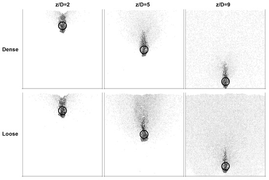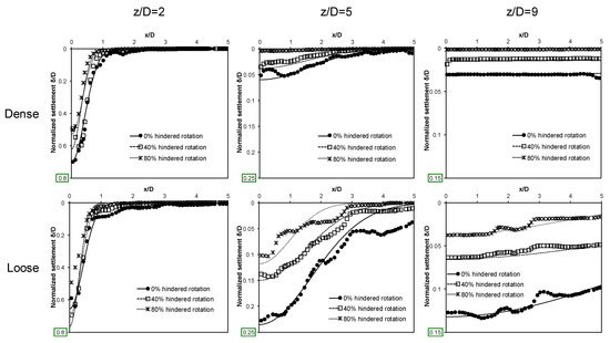 Boundary effects. Some surface settlement profiles do not die out within the simulated width. This is a clear indication that simulations are affected by boundary effects (worst conditions: deep inclusions in loose packings—Figure 5). An alternative view is to consider these simulations as a representative REV that repeats itself with characteristic L-spacing. Similarly, there is some interaction with the lower boundary, particularly in the case of deep inclusions (z/D = 9—see Figure 3 and Figure 4).