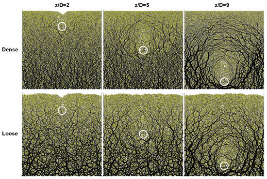 Contact force arching and refilled cavity. Grains in the refilled cavity are loosely packed; the small forces they carry provide transverse support to the granular arches that form around the dissolving zone (see Figure 4 and the complete dataset in Figure S2 of the Supplementary Data). In terms of contact forces, a “ghost zone” remains after dissolution and it extends beyond the original inclusion size. The egg-shaped force arches extend towards the free surface and define more prominent ghost zones in cases that involve deeper dissolution, denser sediments and higher interlocking. Clearly, rotational frustration plays an important role in particle rearrangement; thus, a higher coordination number in denser packings and hindered rotation combine to exacerbate rotational frustration, marked force chains and loose refill.
