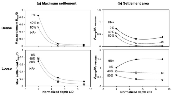 Surface settlement for subsurface cavity dissolution in dense and loose sediments. (a) Normalized maximum settlement δmax to inclusion diameter D. (b) Trough area Atr normalized by the area of contracting zone Acz.