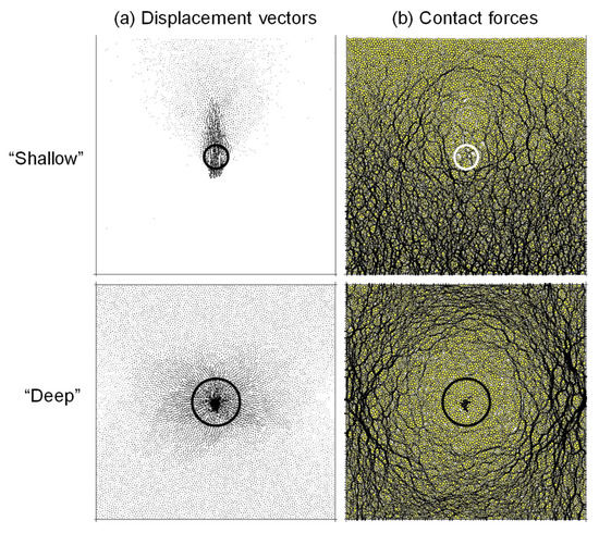 Shallow versus deep volume loss. (a) Displacement vectors and (b) contact forces after dissolution. The deep inclusion is subjected to constant vertical stress of 100 kPa, and both the top and bottom boundaries move in as the inclusion contracts. The circles show the original size of the contracting zone. Note: HR = 40% in both cases.