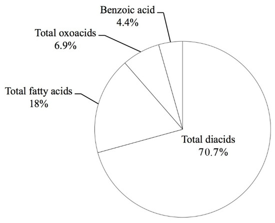 Low-molecular-weight (LMW) dicarboxylic acids (hereafter, diacids) and other organic acids are ubiquitous in the atmosphere, with high concentrations up to few µg m−3 [14,15,16,17,18,19], demonstrating that they are the most important constituents of tropospheric OA [13,20]. Diacids and related compounds can contribute to 0.2–1.8% of total carbon (TC) in urban aerosols from Tokyo [14] and up to 16% of TC in remote marine aerosols from the central Pacific, including the tropics [11]. Previous studies demonstrated that diacids account for up to 10–27% of organic carbon (OC) in aerosols, e.g., [13,21,22].