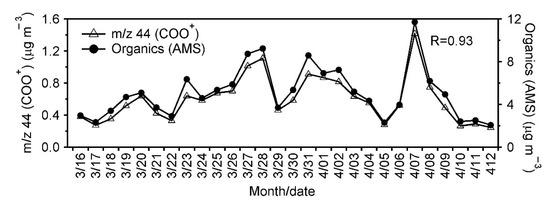 Temporal variations in organics and m/z 44 (COO+) signal measured by AMS in aerosols samples collected from Okinawa.