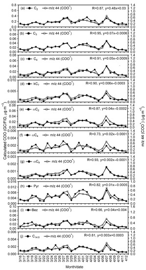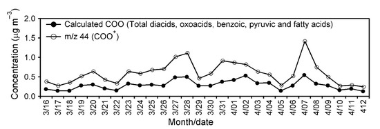 We found strong correlations between m/z 44 signals and the COO of carboxylic acids such as C2 (R = 0.87), C3 (0.95), C4 (0.91), kC7 (0.90), ωC2 (0.87), ωC4 (0.73), ωC9 (0.93), benzoic acid (0.66), and C14:0 fatty acid (0.81) (Figure 4). These carboxylic acids contribute to OOA, as presented by AMS m/z 44 in the aerosols [40,45,57,58]. Except for C13:0 fatty acid (R = 0.84), the correlation of m/z 44 with other fatty acids is not as good as that of C14:0. Figure 5 shows temporal variations in the calculated COO for total diacids, oxoacids, benzoic acid, and total fatty acids obtained by GC and AMS−derived m/z 44. The temporal variations in COO are very similar to those of m/z 44 within the accuracy of the methods. For the calculation of COO, we corrected the concentrations of diacids and related compounds using their recoveries (e.g., 90% for oxalic acid). Some difference (e.g., 7 April, Figure 5) may suggest the presence of unidentified organic acids such as formic, acetic, and propanoic acids that have not been determined by the GC method used.