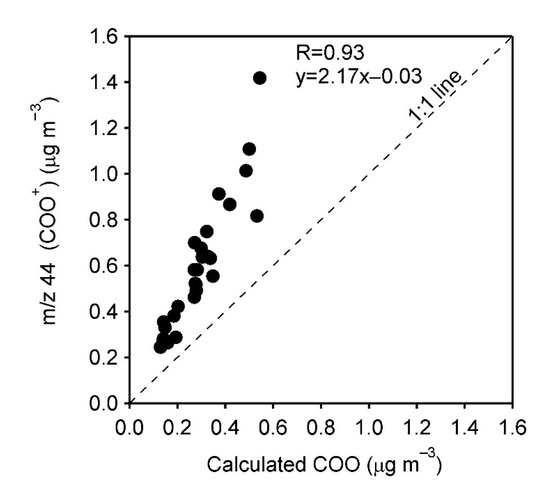 We found that oxalic acid contributes to 16 ± 3.5% of the m/z 44 signal, which is equivalent to 3.45 ± 0.9% of organic matter measured by AMS (OMAMS). The rest of the m/z 44 signal should originate from other diacids as well as mono-/poly-carboxylic acids. Chen et al. [81] reported a significant amount of low-molecular-weight monocarboxylic acids using high-resolution Time-of-Flight AMS in the Southeastern U.S.