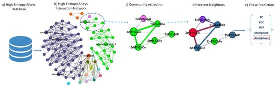 The novelty of this study is the HEA compound phase prediction via the graph-based k-nearest neighbor (KNN) algorithm using the HEA interaction network. The proposed approach first selects all the neighbors of each compound in the network. The compound neighbors are described as , where the compounds are sorted in a descending order based on their weight with the target compound. Then, we used the k first compounds of s and predicted the target compound phase by plurality vote. Figure 1 illustrates the proposed approach. The proposed method uses the set of related descriptors and creates an HEA interaction network based on the similarity between HEA compounds. The same colors in Figure 1b indicate the extracted communities from the HEA network. Figure 1c shows an extracted community as an example. Figure 1d illustrates the selection of the most similar neighbors of the target compound for phase prediction. Finally, it predicts the composition phase. The challenge considered is, if there are a compound’s neighbors in the testing set, it cannot used for voting in phase prediction because its phase is unknown due to their presence on the testing set. Therefore, to deal with this problem, the proposed approach must consider a condition that if a neighbor exists in the testing set, the proposed approach should increase the number of k for neighbors’ selection as long as all the selected neighbors are from the training set.