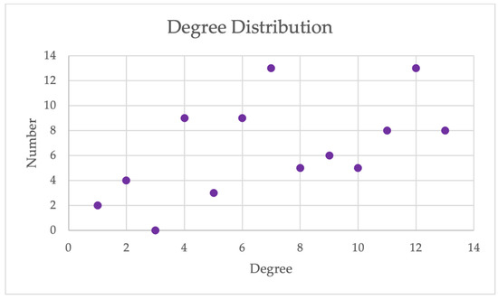 The HEA interaction network was created using Gephi software version 0.9 based on a Fruchterman Reingold layout, as shown in Figure 2. Each node in the HEA graph was a HEA compound. Figure 2 shows a portion of the HEA interaction network in which some connections were filtered for the clarity of the network presentation. As shown in Figure 2, each node in the HEA network is displayed in a specific color and size. Nodes with the same color placed in the same community are more similar. Using the communities in the HEA network, the nearest neighbors of each node were determined. The size of the node circle in Figure 2 indicates the number of connections for each compound to others. Each node with more relations to its neighbors is illustrated by a larger circle. The gradient color of each color for the edges in Figure 2 shows the strength of the connection. The strong relations are indicated by darker and thicker lines. The degree of a node in an HEA network is the number of connections it has to other nodes. The degree distribution is the probability of the distribution of these degrees over the whole network. The degree distribution shows the average connections of each node, which expresses the number of neighbors of each node. The HEA network degree distribution is shown in Figure 3 and was obtained at 8.212.