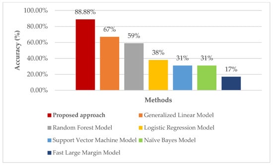 The proposed approach predicts the phase of unseen data. It was compared with six other methods, as shown in Figure 5. The Fast Large Margin model has one-fifth of the accuracy of the proposed approach, which had the worst accuracy in phase prediction. The Support Vector Machine (SVM) and Naïve Bayes model perform the prediction with equal accuracy, which is about twice that of the Fast Large Margin model. The SVM performed classification and regression in supervised learning. The Naïve Bayes Model is conditional-probability-based. The phase prediction by the Logistic Regression model is better than the Fast Large Margin model, the SVM, and the Naïve Bayes model. The Logistic Regression model predicts about 50% less accurately than the proposed approach. The Logistic Regression Model is proper for Boolean variables. The four mentioned methods have less than half the accuracy of the proposed approach. The Random Forest model and Generalized Linear model perform 11% and 19% less accurately than proposed approach. The Generalized Linear Model is linear regression generalization for data that do not have normal distribution. A regression is a hybrid learning method for the classification of data that are too great in number for a decision tree. The structure of a decision tree for learning time and classification is independent of the Random Forest model. The proposed approach outperforms all of the other methods supremely. The comparison in Figure 5 shows the proposed approach has a higher accuracy as compared to the other methods.
