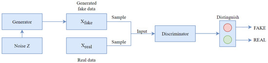 The training process of the GAN is a min–max game, which means that D will minimize the errors when discriminating between true and false data and G will maximize the probability of D’s discriminating errors. Therefore, in the actual training process, D will sample from the real data x and the data G(z) generated by G. Then, D will bring the probability as close to 1 as possible when determining x as real data and bring the probability as close to 0 as possible when determining x as fake data.