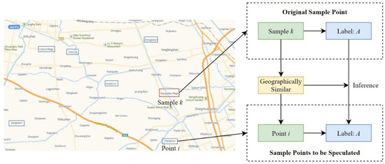 According to the Third Law of Geography, the more similar the geographical environment, the more similar the geographical features [13]. Since these generated new sample points that are similar in space to the original sample points, the geographical environments of these sample points can be considered to be similar. Therefore, we can assign to these new sample points the classification label of the center point. This method is essentially an inference process, using the Third Law of Geography to infer the neighboring points around the sample point. Figure 3 displays the framework of this method.