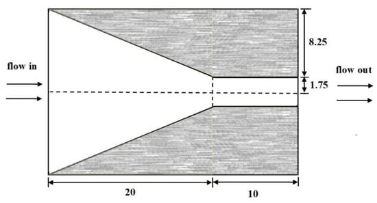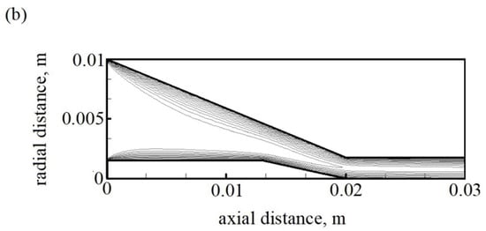 The flow field inside the hollow tapered cylinder with the conical column or without the conical column was calculated using two-dimensional Navier–Stokes and continuity equations under the assumption of incompressible, steady, axisymmetric, viscous, and laminar fluid flow, while air was assumed to be 20 °C and 1 atm. This study then solved the governing equations that have been discretized using the finite volume method by the SIMPLE algorithm []. With the above assumptions, the Navier–Stokes and continuity equations used in this study can be expressed in the following form: