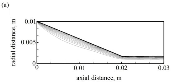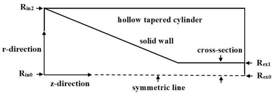 where represents the radius of the hollow tapered cylinder at the inlet, is the radius of the hollow tapered cylinder at the outlet, is the inlet concentration, is the concentration at different cross sections, is the inlet velocity, and is the axial velocity at different cross sections.