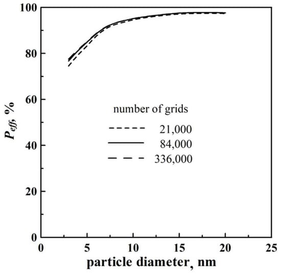 Several meshes were tested in this study to obtain an appropriate number of grids to ensure optimal grid independent solutions. Figure 3 shows the variations in the penetration efficiency of the hollow tapered cylinder without conical column for different grid sizes of 21,000, 84,000, and 336,000 at the flow rate of 2 L/min. When the number of grids was increased from 21,000 to 84,000, the numerical penetration efficiency of the hollow tapered cylinder without the conical column for 5 nm particles changed from 83.3% to 84.9%. While the number of grids was further increased from 84,000 to 336,000, the numerical penetration efficiency only changed from 84.9% to 85.1%. Therefore, 84,000 grids were used in the simulation.