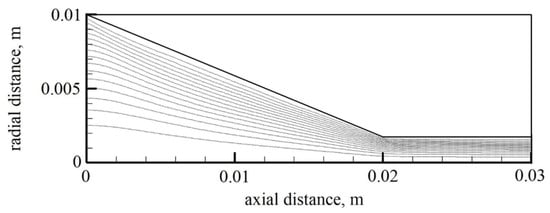 In this study, a numerical investigation of the nanoparticle penetration characteristics within the hollow tapered cylinder was carried out. Figure 1 outlines a schematic diagram of the hollow tapered cylinder. The selecting conditions of the numerical simulation for the hollow tapered cylinder with the conical column were based on the studies of nanoparticle diffusion deposition measurements in the needle chargers. This study adopted a geometric design similar to that of the needle charger without applied voltage []. The numerical penetration efficiency of the hollow tapered cylinder with the conical column was therefore compared with the experimental data. For the boundary conditions of the computational domain, zero particle concentration is applied to all the solid walls of the hollow tapered cylinder with or without the conical column. The number concentration adopts the uniform distribution at the inlet of the hollow tapered cylinder, and the zero concentration gradient in the flow direction at the outlet. When calculating the nanoparticle transport in the hollow tapered cylinder with or without the conical column, it is assumed that interactions between particles can be ignored. When particles are introduced into the hollow tapered cylinder, the particles are assumed to be spherical and their presence does not influence the flow field. Furthermore, the flow field within the hollow tapered cylinder with or without the conical column is assumed to be axisymmetric with no flow in the azimuthal direction. The main numerical domain used to calculate the hollow tapered cylinder is shown in Figure 2, where the wall of the hollow tapered cylinder was set as the solid boundary conditions. This computational domain used a total of 84,000 (200 in the r-direction × 420 in the z-direction) non-uniform rectangular grids.