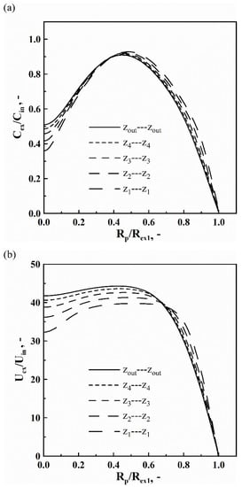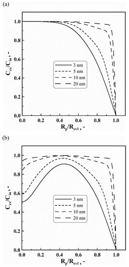 In comparison, the concentration of larger particles (10 nm and 20 nm) begins to drop rapidly after approaching the outer position of . Figure 7b shows the concentration profile at the outlet cross section of the hollow tapered cylinder with the conical column. It can be seen that the concentration of the smaller particle size particles (3 nm and 5 nm) in the area close to the center point is significantly lower than that without the conical column. The lower concentration in the central region of the outlet is caused by the diffusion effect resulting in more loss on the wall of the conical column. In addition, the highest concentration appears at the position of about = 0.43~0.52 for the smaller particles (3 nm and 5 nm), and the concentration also decreases in the vicinity of the peripheral part similar to that without the conical column. The results show that the concentration of nanoparticles at the outlet of the hollow tapered cylinder is lower for the smaller the particle diameter under the same conditions. This is because the particles with the smaller size have a more obvious diffusion effect, resulting in a greater loss of particles adjacent to the wall surface, so some particles cannot reach the outlet of the hollow tapered cylinder.
