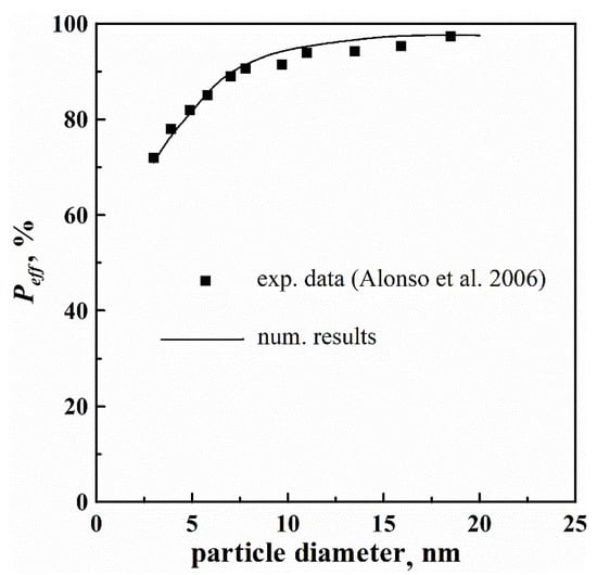The study then evaluates the effect of the conical column within the hollow tapered cylinder on the nanoparticle penetration efficiency. Figure 8 shows the numerical nanoparticle penetration efficiencies of the hollow tapered cylinder with the conical column compared with the experimental data in the literature []. The results demonstrate that the present numerical model has a good agreement with the experimental data for the flow rate of 2.0 L/min. It should be noted that the experimental data in the literature is the nanoparticle loss of the needle charger without applied voltage under the same conditions as in this study. The particle penetration efficiency was obtained by subtracting the nanoparticle loss from 100% and comparing it to the numerical results. Figure 9 represents the nanoparticle penetration efficiency as a function of the particle size for the hollow tapered cylinder without or with the conical column at different flow rates. It can be seen that the particle penetration efficiency increases with the increasing particle diameter inside the hollow tapered cylinder without the conical column. In addition, the penetration efficiency can be improved by increasing the flow rate. This is because the residence time is not sufficient for the particles to reach the walls of the hollow tapered cylinder for the higher flow rates. This finding can be applied to the measurement of nanoparticles in environments using hollow tapered cylinders. For many particle measuring instruments, the hollow funnel is required in front of it to collect nanoparticles [,]. Therefore, knowing the nanoparticle penetration efficiency and concentration distribution of the hollow tapered cylinder is helpful for the correctness of nanoparticle measurements and the determination of nanoparticle sources. Although the size of the tapered funnel used to collect the particles is larger than that of the hollow tapered cylinder without the conical column calculated in this study. However, from a dimensionless parameter point of view, they have the similar geometries and the penetration parameter (, D: the nanoparticle diffusion coefficient, s: the length, q: the flow rate). For example, the penetration parameter of 3 nm particles for the tapered funnel with the inlet length of 40 cm at the flow rate of 5.5 L/min and the hollow tapered cylinder without the conical column at the flow rate of 0.5 L/min is 0.0025 and 0.0021, respectively. Therefore, the present numerical models are considered suitable for the application to the geometric similarity inlets.
