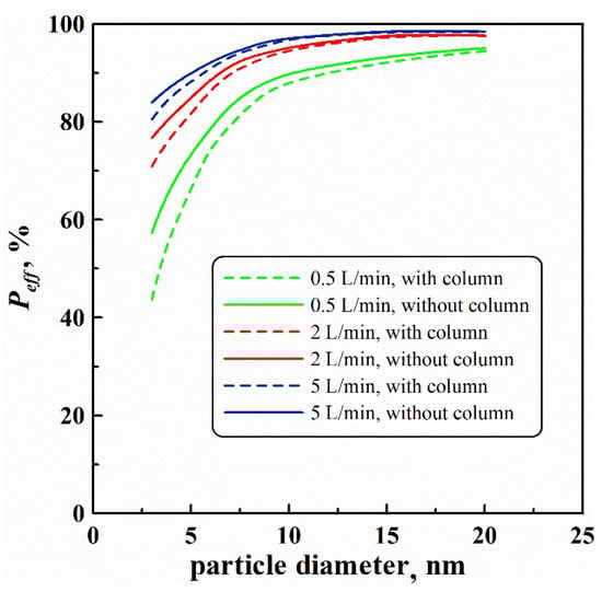 Additionally, a similar trend can be found from the penetration efficiency of the hollow tapered cylinder with the conical column. It should be noted that the penetration efficiency of the hollow tapered cylinder with the conical column is lower than that of the hollow tapered cylinder without the conical column. For particles with a diameter of 3 nm, the penetration efficiency of the hollow tapered cylinder with the conical column is about 66.3% at a flow rate of 0.5 L/min, which can be improved to about 73.4% by removing the conical column. This is due to the large loss of the diffusional nanoparticles on the column wall inside the hollow tapered cylinder, resulting in the lower penetration efficiency.